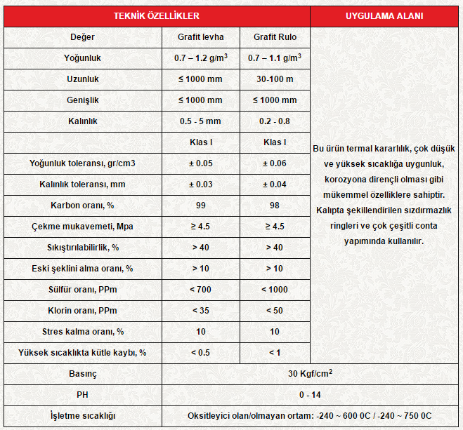 takviyeli grafit levha olarak üretilir ve yaygın olarak akışkan